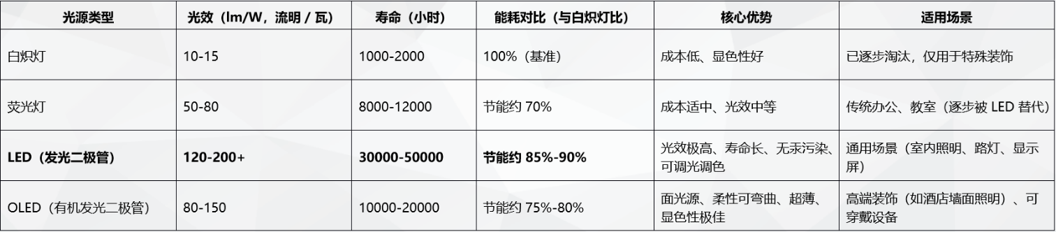 光源是能源消耗的直接主体,高效光源能从源头降低能耗,目前主流技术已从传统光源(白炽灯、荧光灯)全面转向半导体光源。