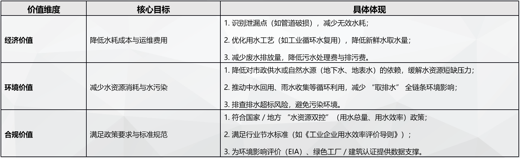 1. 隐性问题:用水工艺落后(如用新鲜水清洗设备)、循环水利用率低、再生水回用潜力未挖掘、绿化灌溉方式浪费(如漫灌)。